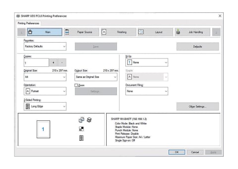 The printer driver setup window features a simple design that includes larger buttons and drop-down menus, making it easier than ever to use printer functions.