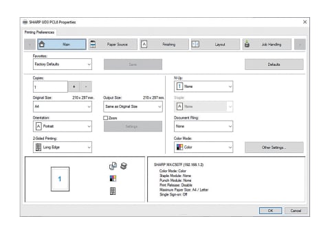 The printer driver setup window features a simple design that includes larger buttons and drop-down menus, making it easier than ever to use printer functions.